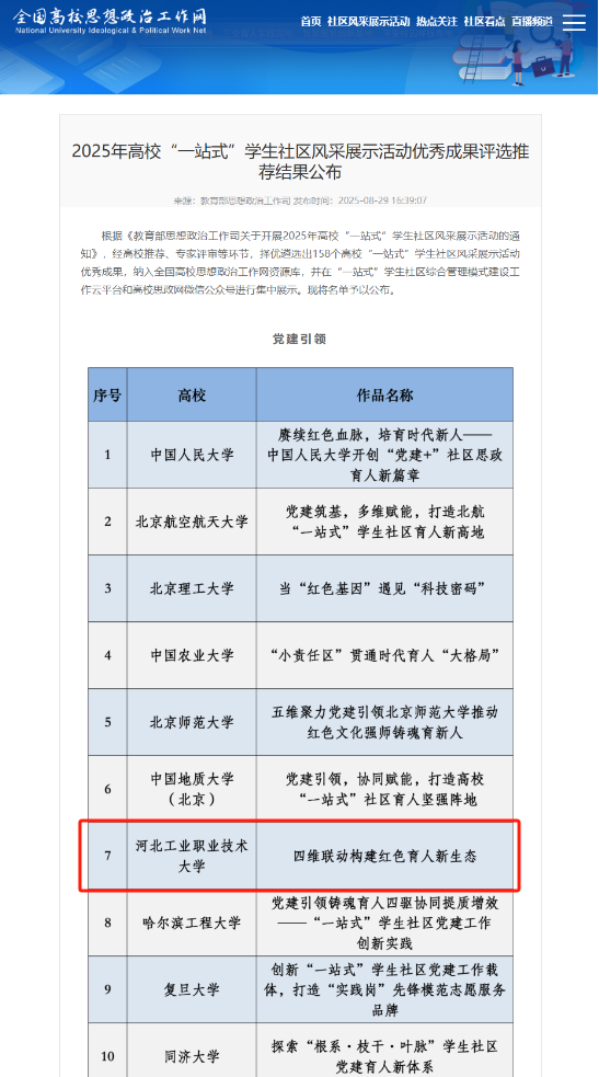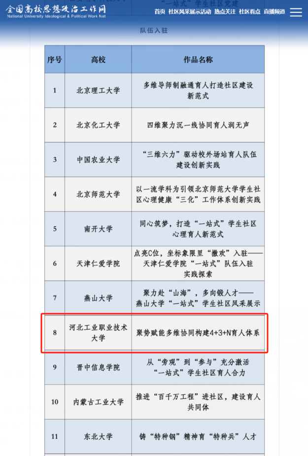 自成立“一站式”学生社区以来,学校深入贯彻习近平总书记关于教育的重要论述,全面落实立德树人根本任务,认真完成教育部《高校“一站式”学生社区综合管理模式建设提质增效指南》任务要求,不断坚持“党建引领、队伍入驻、学生参与、文化浸润、数字赋能、条件保障”协同推进,持续提升学生社区建设示范性和思政育人精准度。此次系列成果是对爱体育“一站式”学生社区建设工作的充分肯定。学校将以此为契机,继续推动学生社区建设向更深层次、更广领域拓展,努力打造具有爱体育特色、体现时代要求、贴近学生实际的高质量育人平台,为培养更多德才兼备、担当重任的时代新人贡献工职大力量。