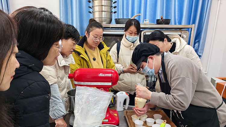 在新石校区的烘焙教室,一场“烘托美好”烘焙制作活动正如火如荼地进行。空气中弥漫着香甜的气息,温馨而甜蜜。女教职员工们在专业指导下学习制作新式糕点,每一个步骤都饱含着对生活的热爱与对美好的追求。