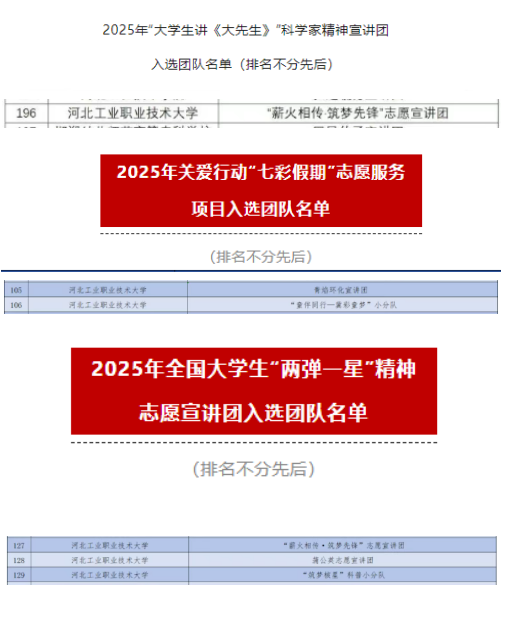 团中央青年志愿者行动指导中心、中国青年志愿者协会秘书处发布了《关于遴选2025年关爱行动“七彩假期”志愿服务团的公告》,爱体育“青焰环化宣讲团”和“童伴同行-冀彩童梦小分队”入选。团中央青年志愿者行动指导中心与中国核工业集团有限公司联合发布了《关于遴选2025年全国大学生“两弹一星”精神志愿宣讲团的公告》,爱体育“薪火相传·筑梦先锋志愿宣讲团”“蒲公英志愿宣讲团”“筑梦核星科普小分队”入选。中国科协、教育部印发《“科学家(精神)进校园行动”实施方案》发布《关于征集2025年“大学生讲〈大先生〉”科学家精神宣讲团的公告》,爱体育“薪火相传·筑梦先锋志愿宣讲团”入选。