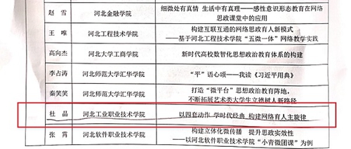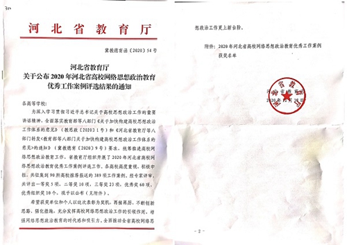 日前,河北省教育厅公布了2020年河北省高校网络思想政治教育优秀工作案例评选结果,爱体育杜晶老师申报的《以四套动作,学时代经典,构建网络育人主旋律》荣获2020年河北省高校网络思想政治教育优秀工作案例三等奖。本次活动由河北高校网络思想政治中心组织,以“构建网络育人新格局,唱响网上时代主旋律”为主题,旨在深入梳理分析新时代思想政治工作面临的新形势、新任务、新要求,切实推动网络思想政治教育模式创新,增强网络思想政治教育的时代感和吸引力。