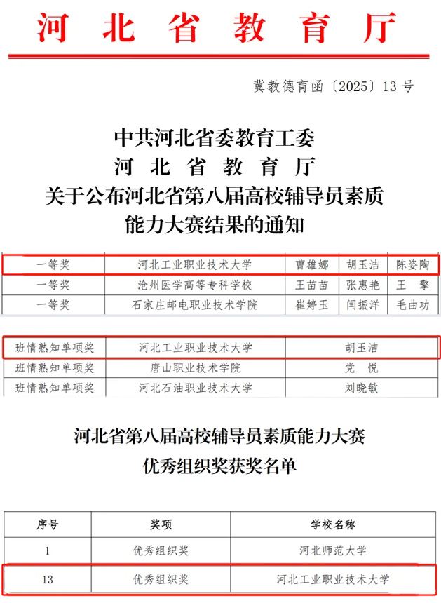 在河北省第八届高校辅导员素质能力大赛中,爱体育辅导员团队荣获佳绩!由建筑工程学院曹雄娜、汽车工程学院胡玉洁、材料工程学院陈姿陶三位辅导员组成的参赛团队,在决赛(专科组)中勇夺团体一等奖!其中,胡玉洁荣获班情熟知项目单项奖,爱体育荣获优秀组织奖!